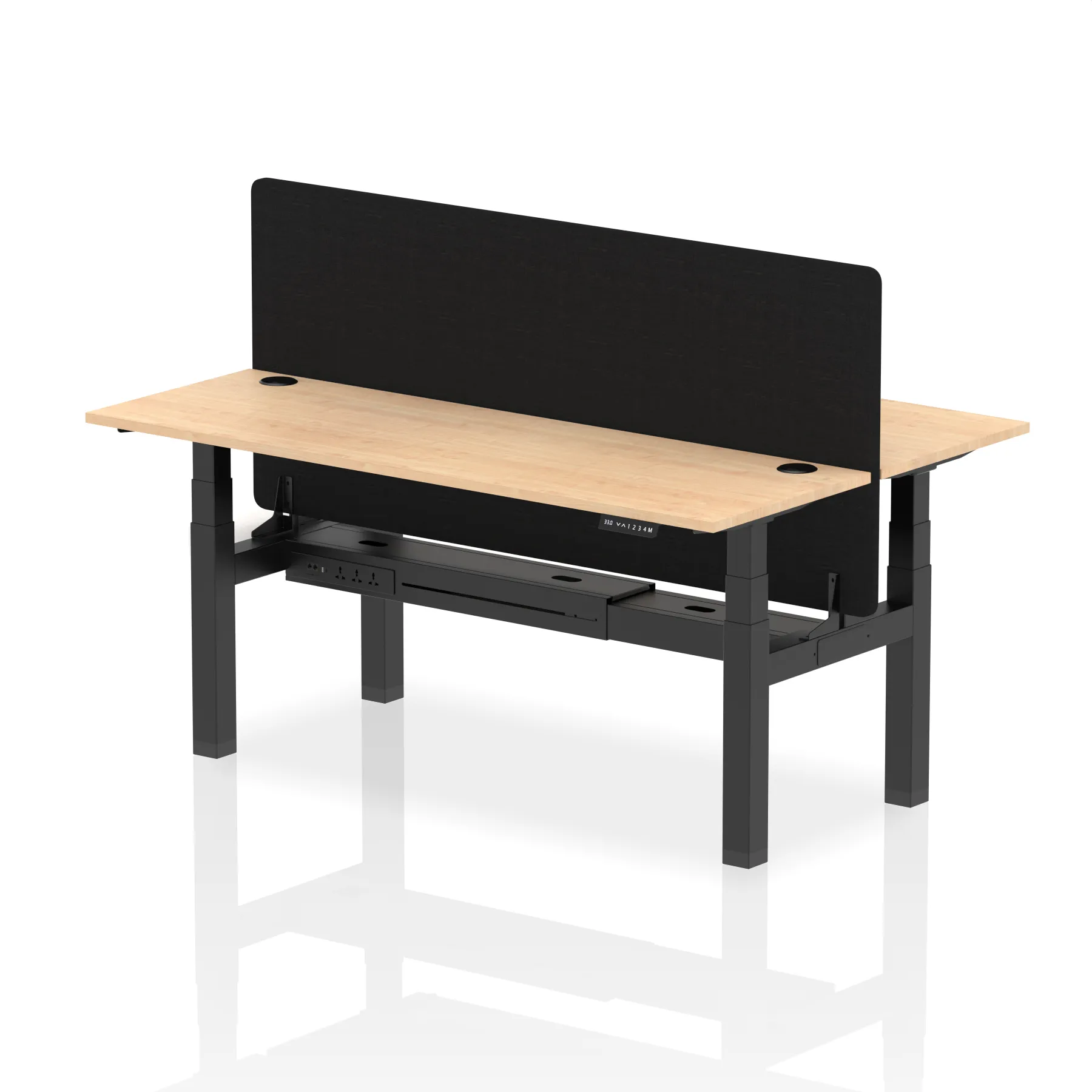 Meet the Air Back-to-Back Slimline Height Adjustable Desk, a sleek solution for two. Each desk includes a dividing screen, two Ethernet ports, a USB port, a USB-C port, and three UK plugs for unparalleled connectivity. Cable ports ensure a clean, organized workspace. Its adjustable height promotes ergonomic comfort. Perfect for collaborative, tech-driven teams, this desk combines slim design with functionality for a modern, efficient office environment.