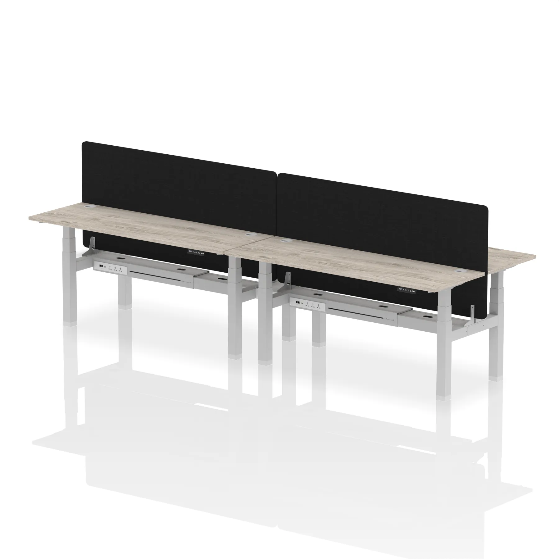 Meet the Air Back-to-Back Slimline Height Adjustable Desk, a sleek solution for four. Each workstation includes dividing screens, with two Ethernet ports, a USB port, a USB-C port, and three UK plugs per desk. Cable ports ensure a clean, organized workspace. Its adjustable height promotes ergonomic comfort. Perfect for collaborative, tech-driven teams, this desk combines slim design with functionality for a modern, efficient office environment.