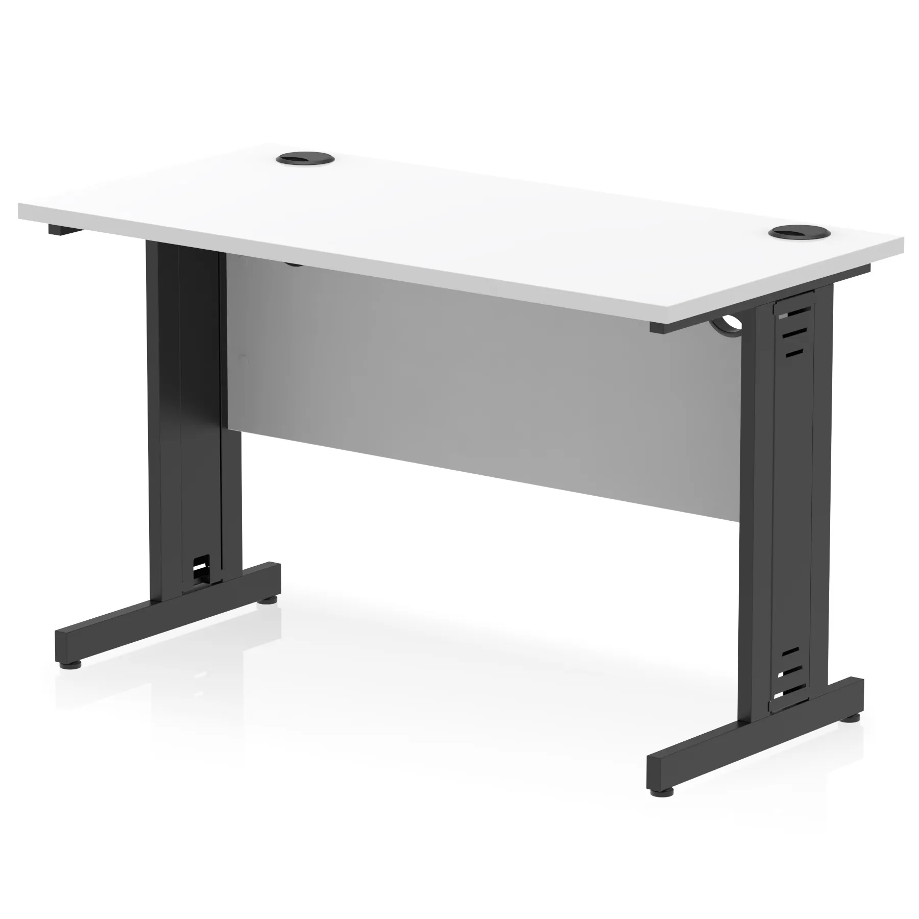 Impulse contract desk | 25mm tops | Heat resistant melamine finish | 18mm modesty panels | 2mm protective abs edging | Cable managed legs | 2 cable ports | Height adjustable feet | Steel to steel fixings | 2 modesty panels slots| Deep set modesty panel (5″) allows for compatibility of most screen clamp fittings | Weight Capacity 135Kg