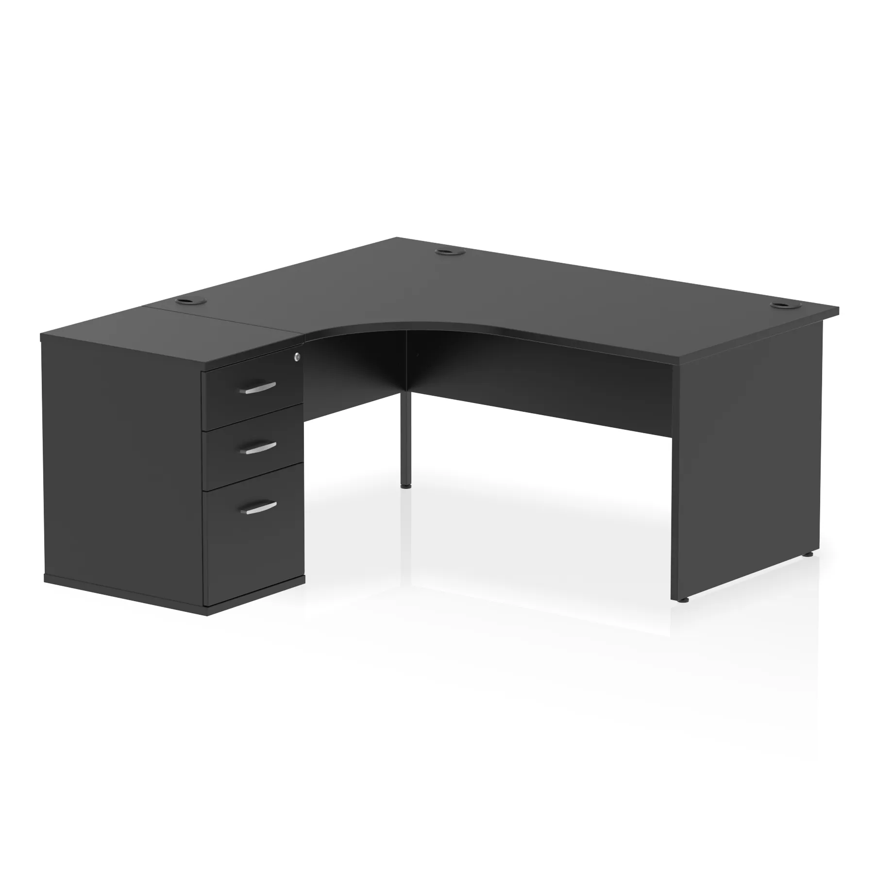 Impulse contract workstation | 25mm tops | Desk and pedestal combined | Heat resistant beech melamine finish | 18mm modesty panel | 2mm protective abs edging | Matching panel ends | Multiple cable ports | Height adjustable feet | Steel to steel fixings | Modesty panel slots wire slots| Deep set modesty panel (5″) allows for compatibility of most screen clamp fittings