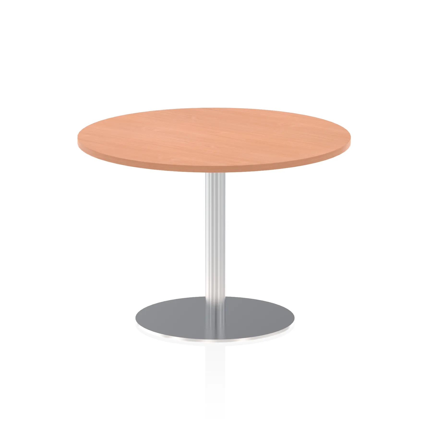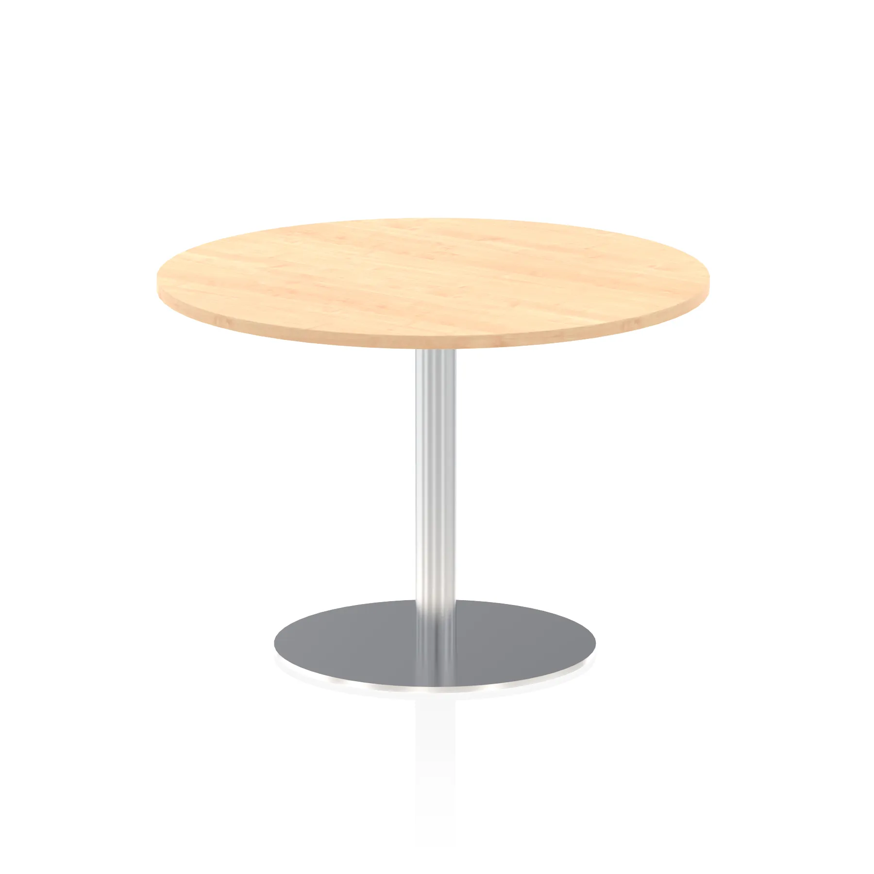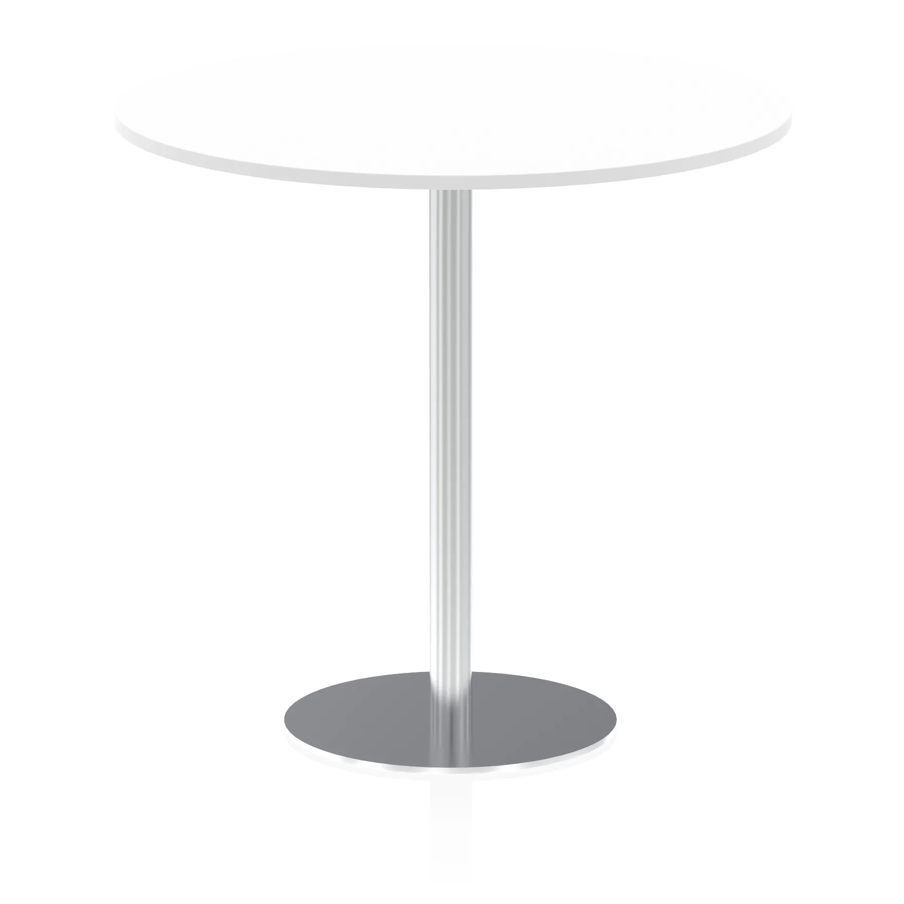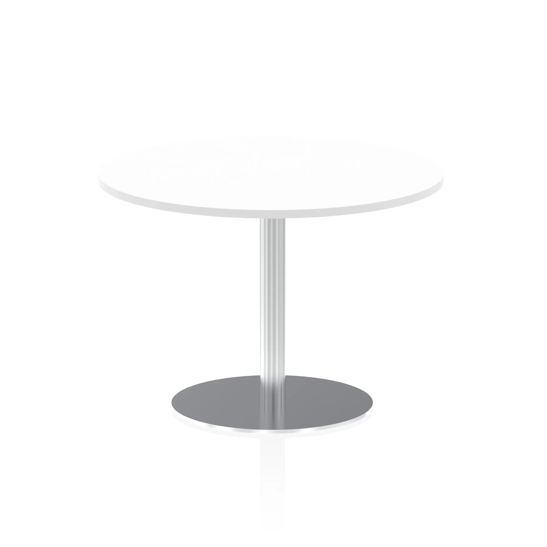 25mm thick desk top profile | Brushed stainless steel effect circular base (580mm diameter) | Brushed stainless steel pillars (76mm diameter) | Weighted base provides stability | Two part bolted frame system