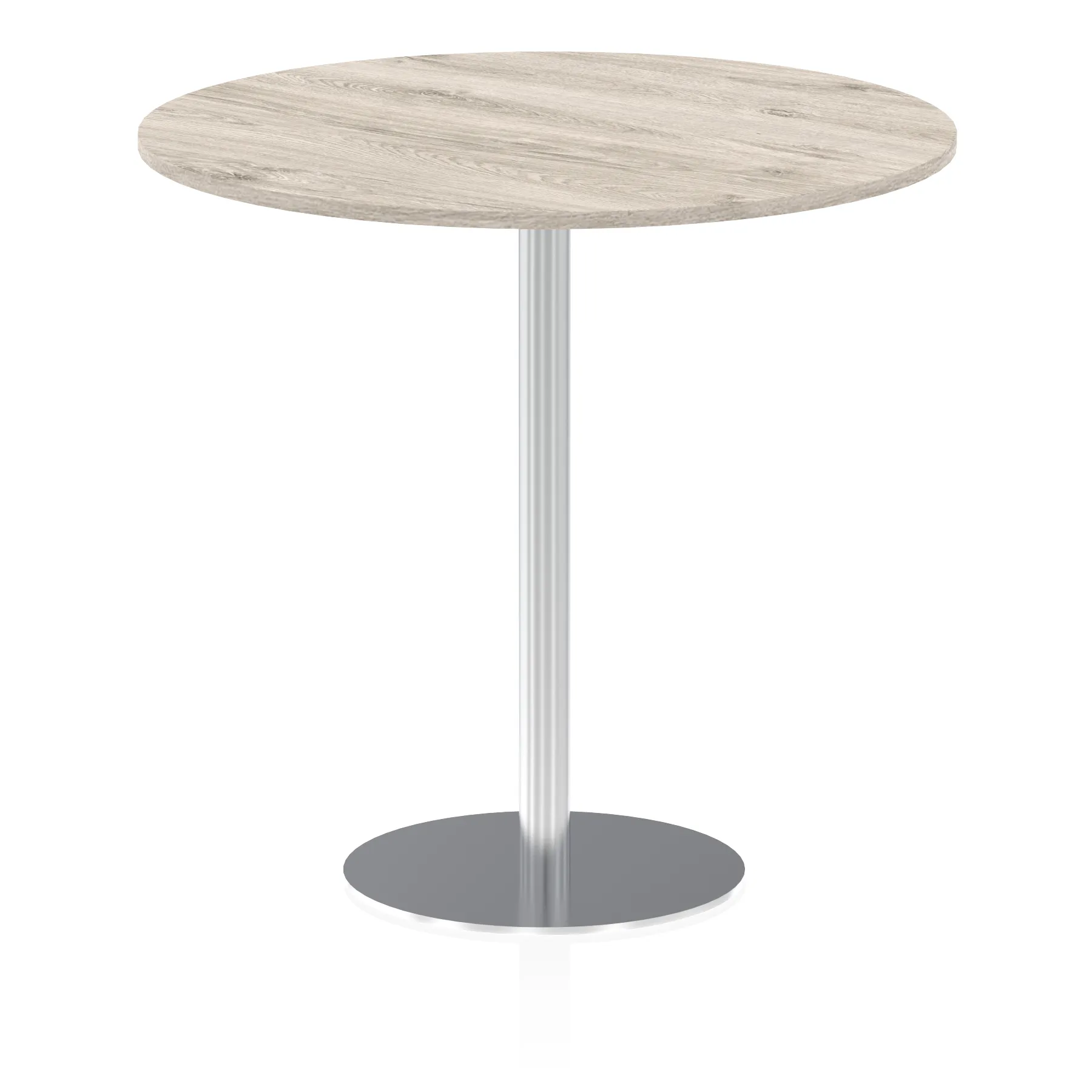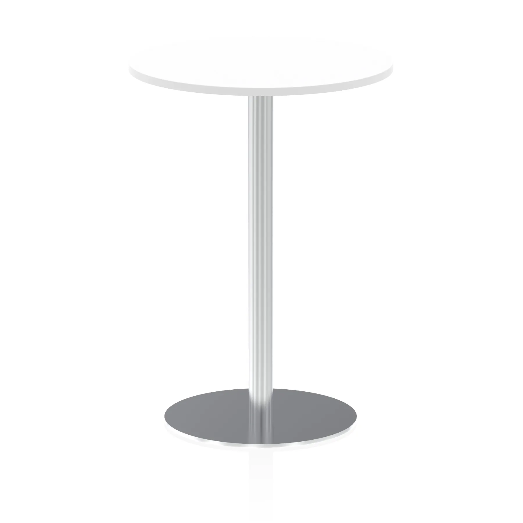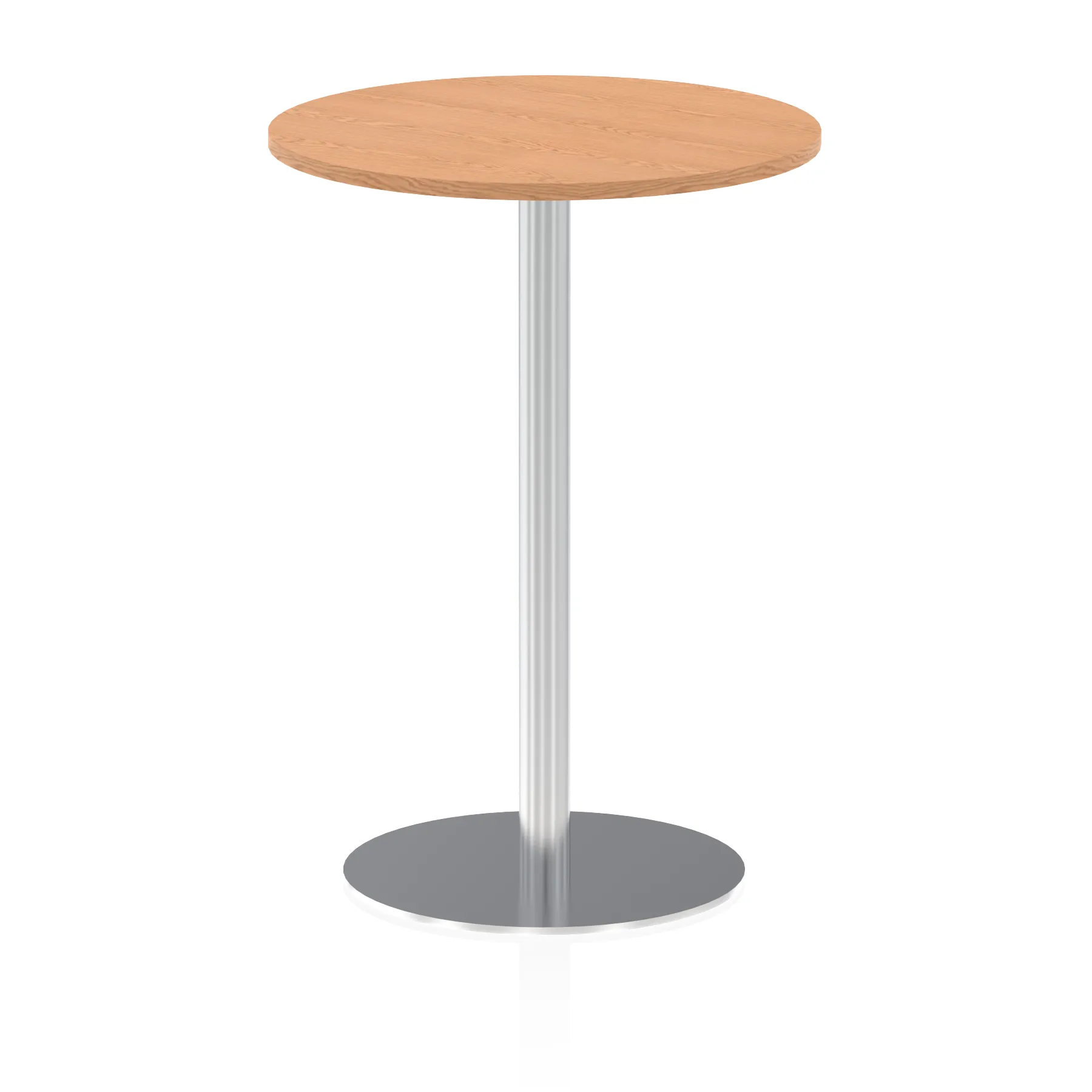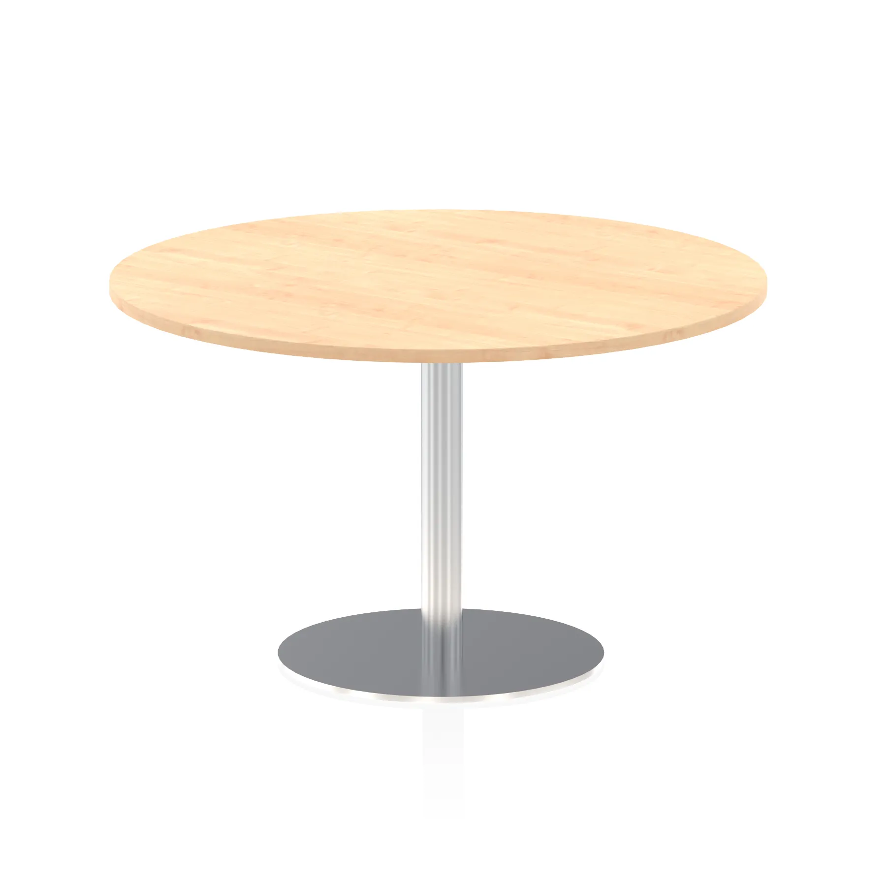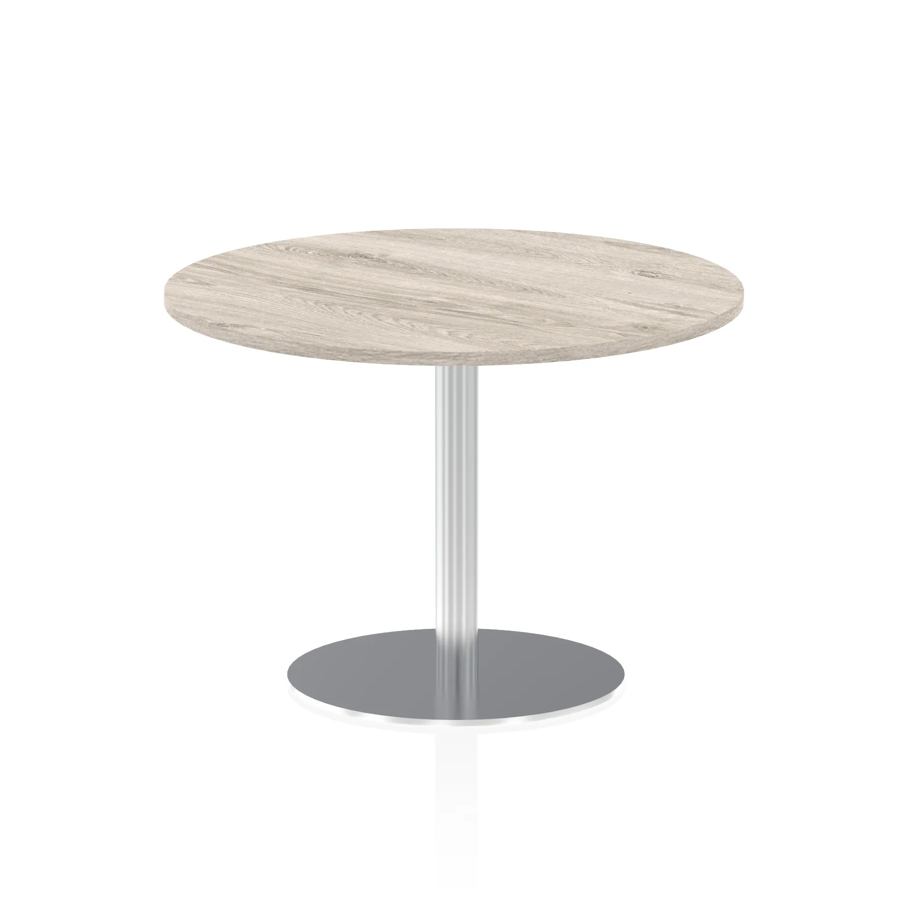 25mm thick desk top profile | Brushed stainless steel effect circular base (580mm diameter) | Brushed stainless steel pillars (76mm diameter) | Weighted base provides stability | Two part bolted frame system