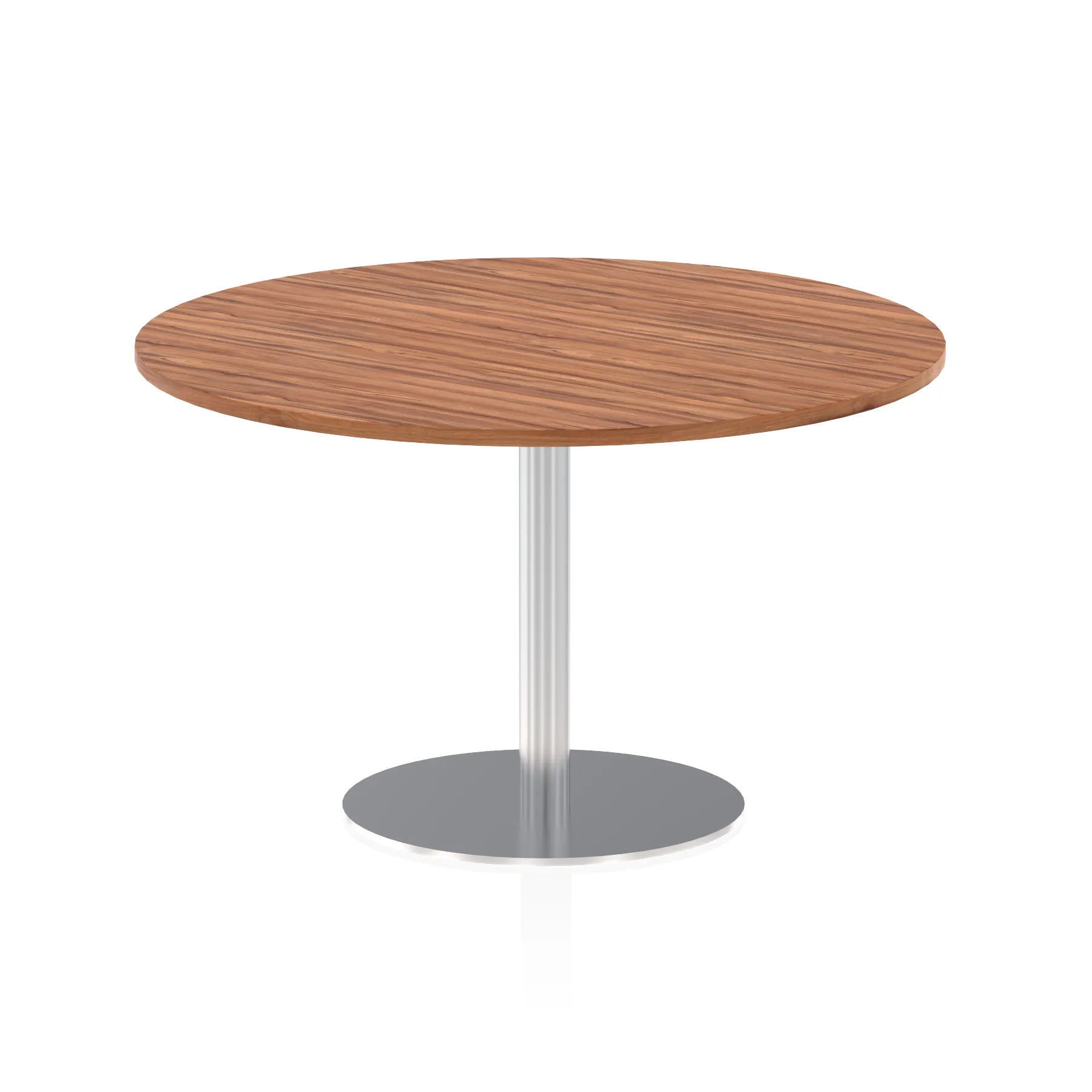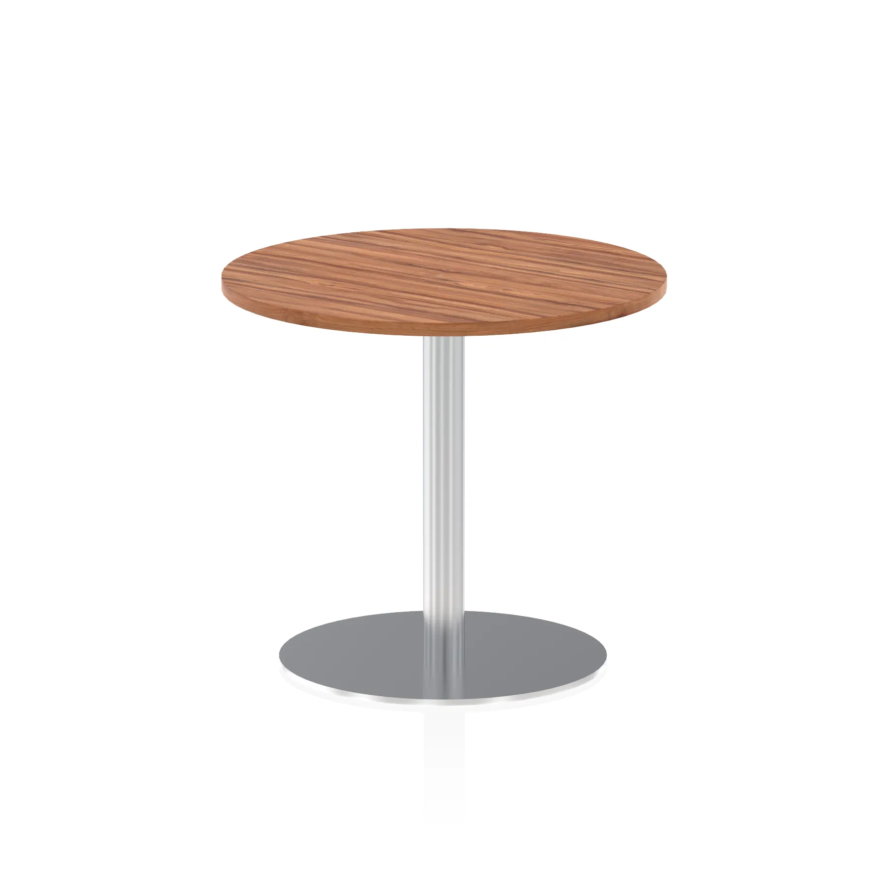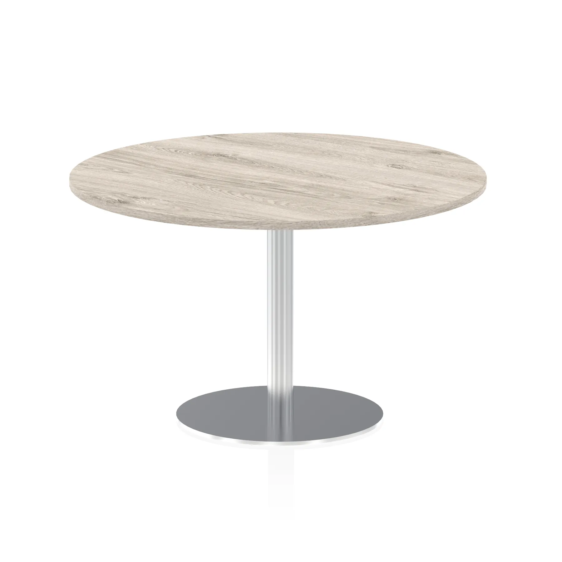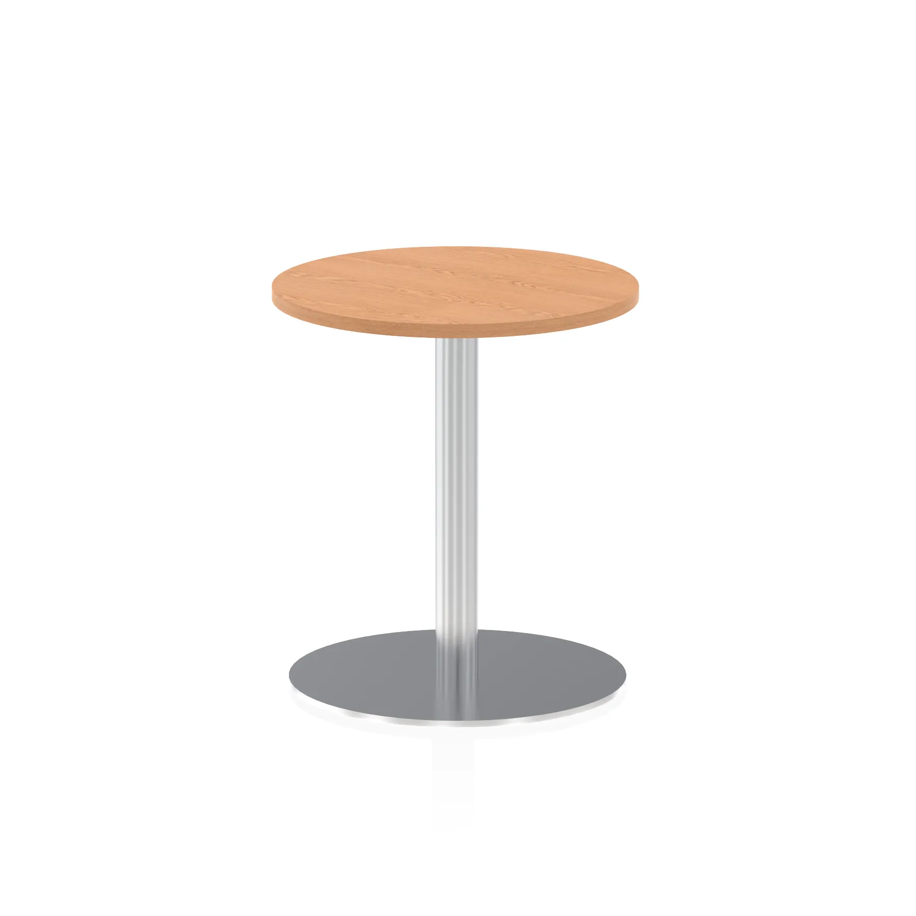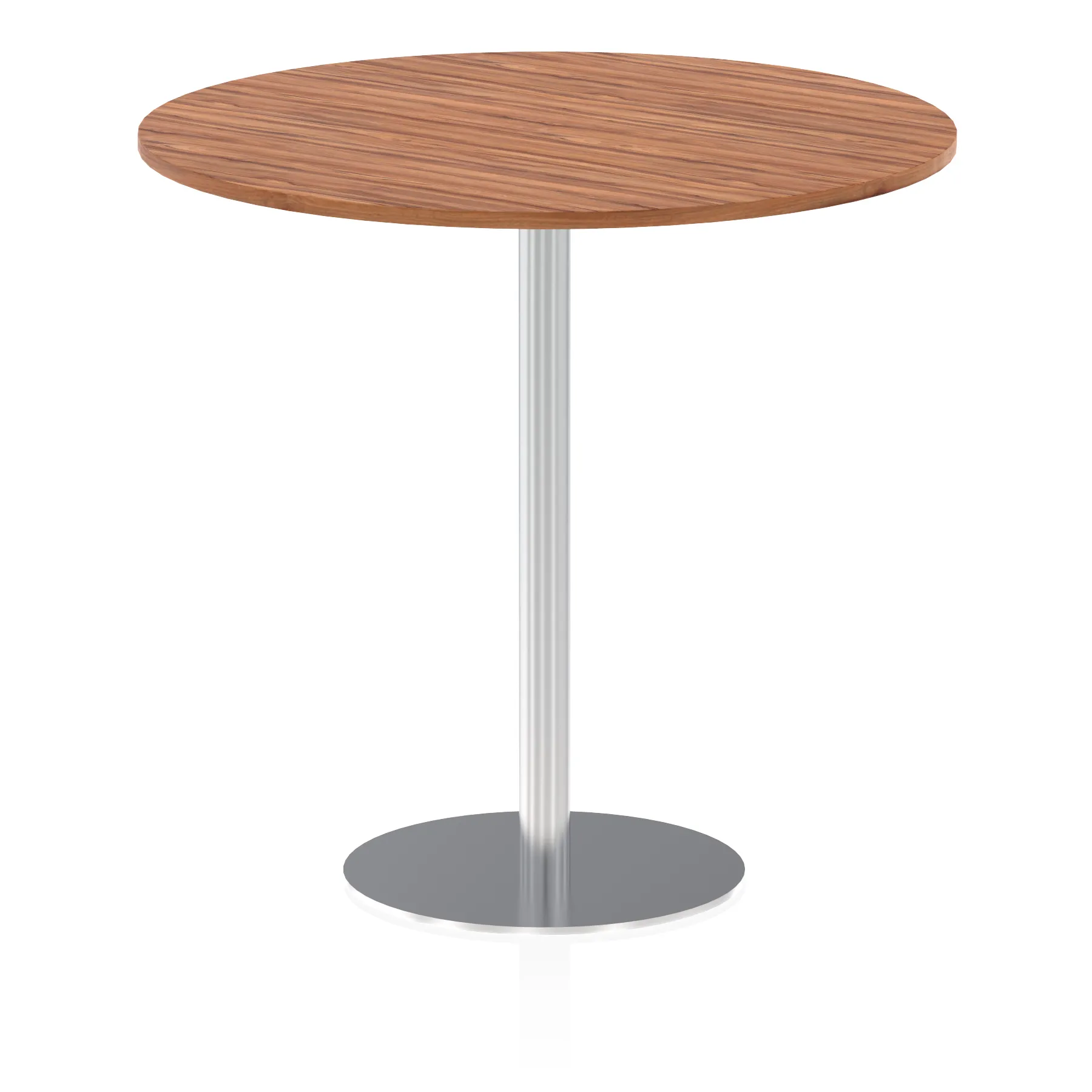 25mm thick desk top profile | Brushed stainless steel effect circular base (580mm diameter) | Brushed stainless steel pillars (76mm diameter) | Weighted base provides stability | Two part bolted frame system