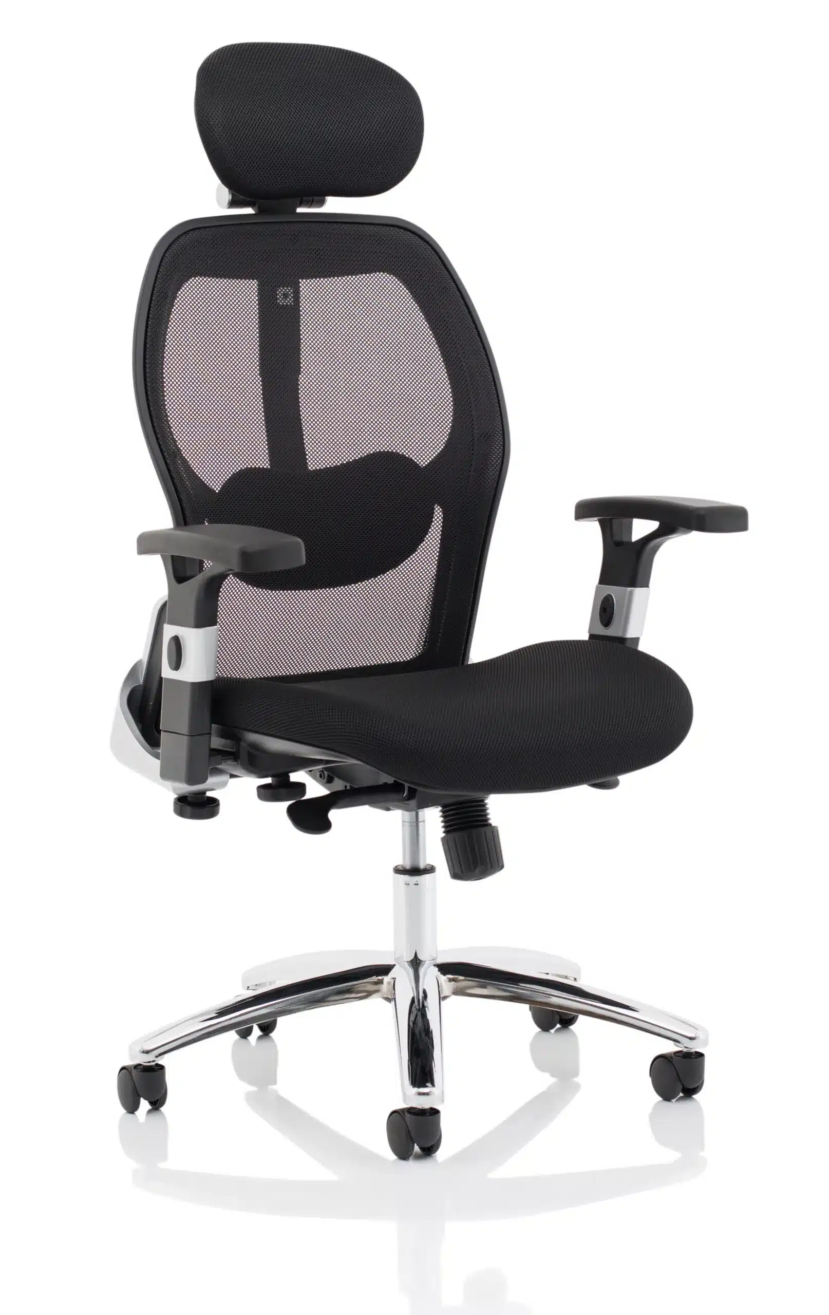 • Contoured airmesh fabric seat • Mesh back with adjustable lumbar pad • Twin lever mechanism offers gas lift and tilt adjustment with tilt tension adjustment • Height adjusting arms • Adjustable airmesh headrest • Chrome 5 star base