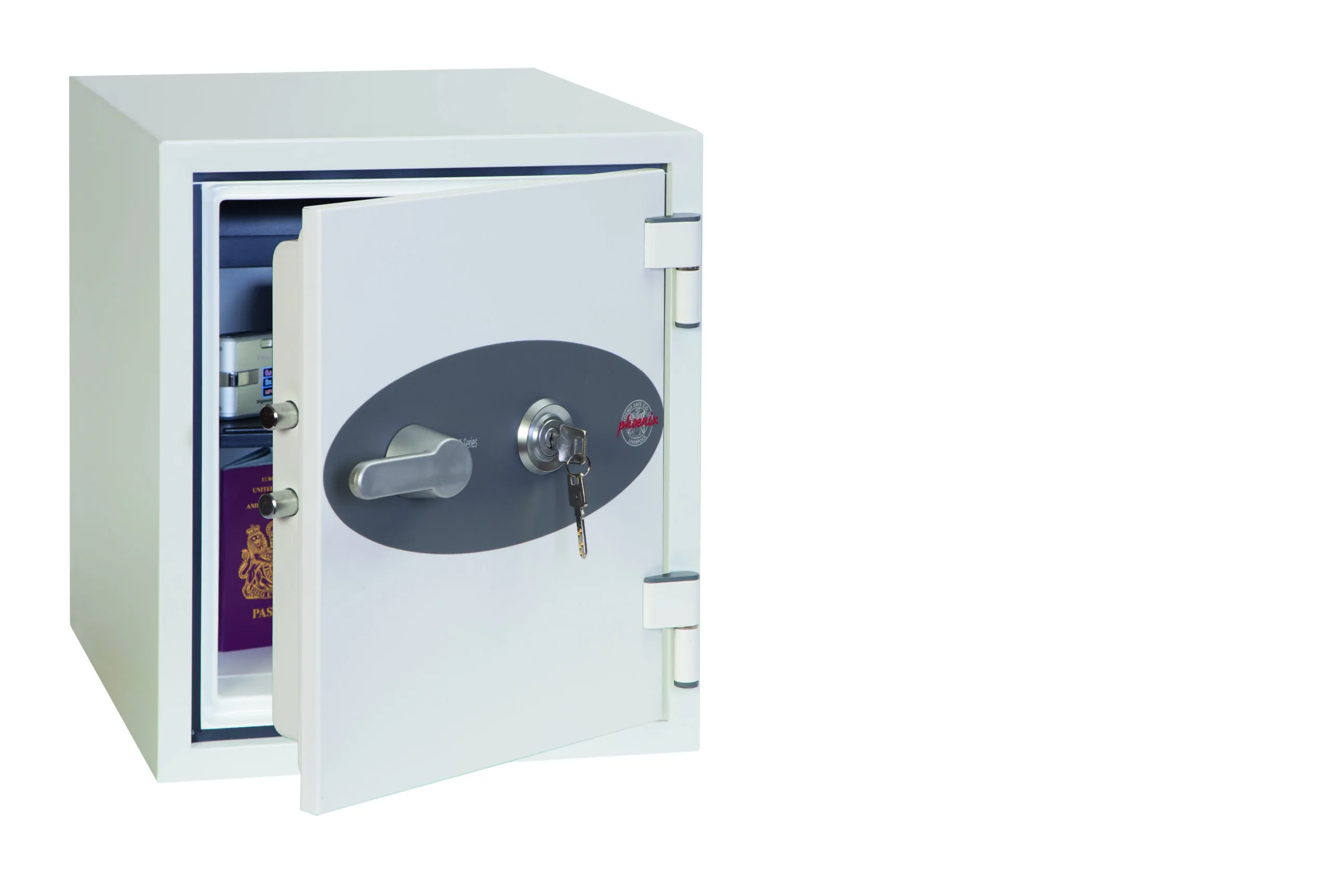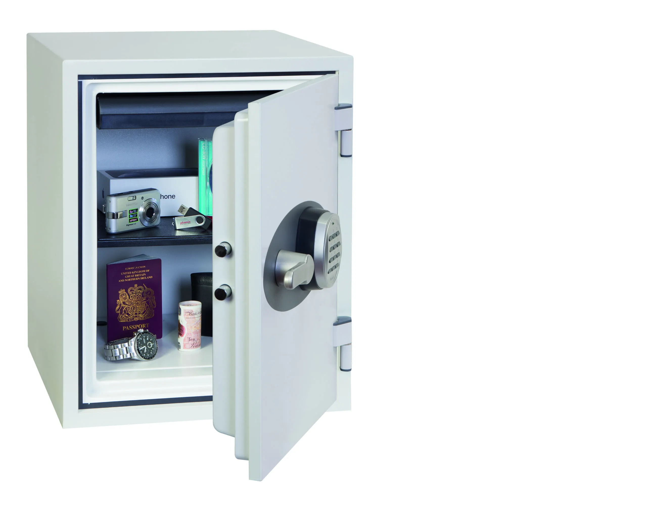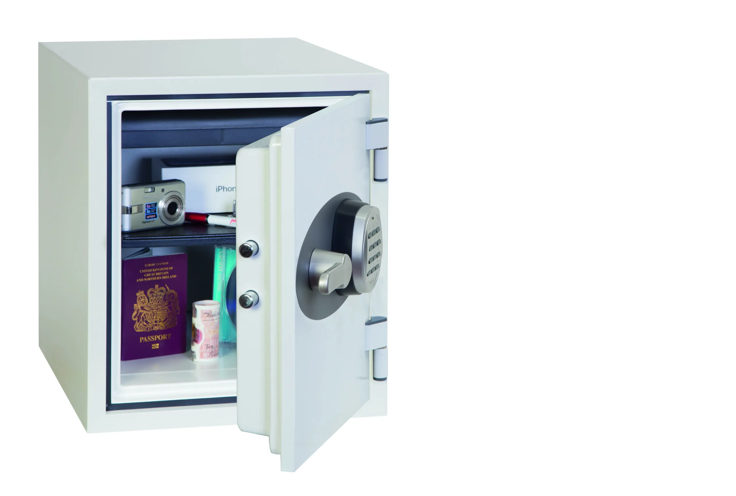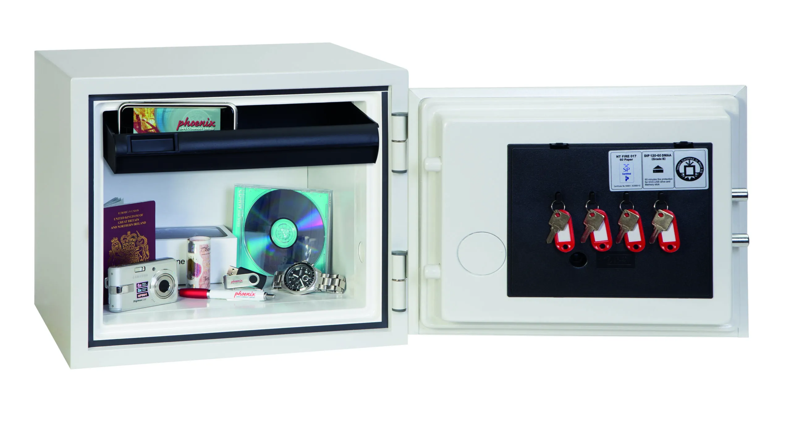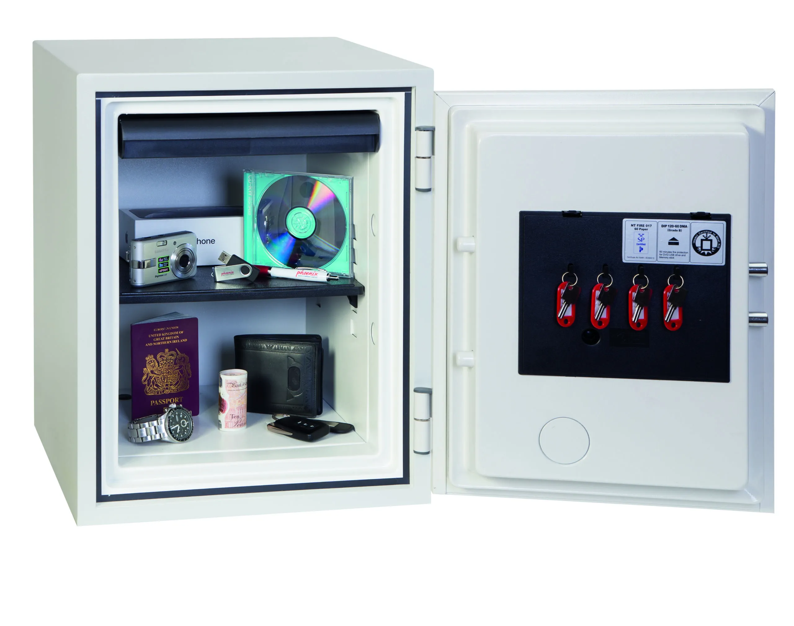 FIRE PROTECTION (PAPER) – Tested to the International NT Fire 017 – 60 fire test standard, at the Swedish SP Testing Centre providing 60 minutes fire protection for paper documents | FIRE PROTECTION (DIGITAL MEDIA) – Tested to MTC – DIP120 – 60DM fire test standard, providing 60 minutes fire protection for digital media, DVD’s, USB memory sticks & hard drives | SECURITY PROTECTION – The safe is recommended for an overnight cash risk of £2,000.00 or £20,000.00 valuables and is also ready prepared for floor fixing, with fixing bolts for concrete floors supplied | DROP TEST – Drop tested from 9.1 metres for resistance to the impact of falling through the burning floors of a building or the collapse of the building | SPECIAL FEATURES – Supplied with 4 internal key hooks, pull out drawer and (for Size 2 or 3) height adjustable shelf | COLOUR – Finished in a high quality scratch resistant paint RAL9003 White